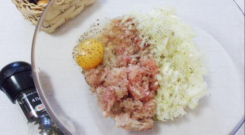 М'ясний фарш перекласти в миску. Додаємо дрібно нарізані цибулю і часник, одне яйце, сіль і чорний мелений перець за смаком. Добре перемішуємо. Крок 2