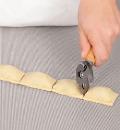 тісто розкачати в пласт товщиною 3-4 мм і наріжте смугами шириною 10 см. Розкладіть по смугах тесту по 1 ч. л. (Або трохи менше) фаршу на відстані 3 см від одного довгого краю і в 6-7 см один від одного. Крок 6