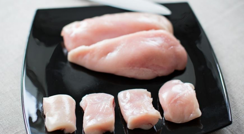 Далі легкими рухами перетворюємо курячу грудку в рівні (або близькі до того) шматки. На відміну від свинини курку я ріжу трохи дрібніше (4х4 см приблизно), шматочки у мене виходять трохи плоскими. Грудка славиться тим, що при приготуванні швидко висихає, але ми цього не допустимо. Крок 3
