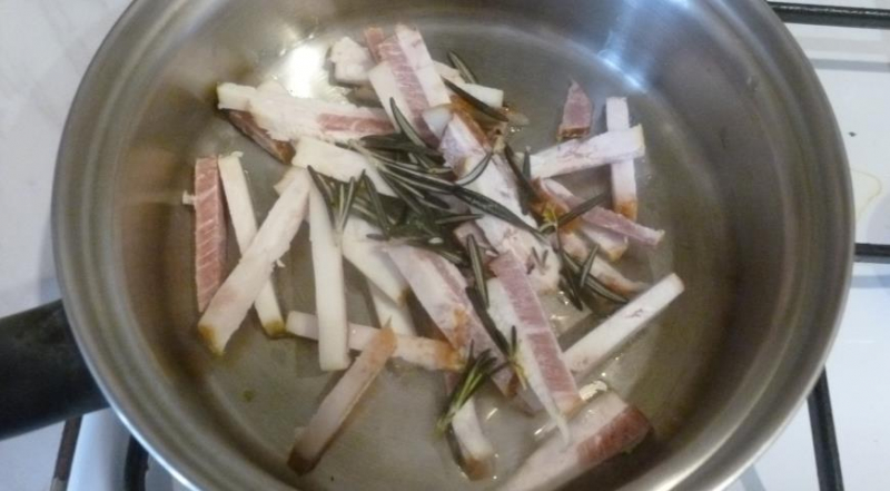 Для соусу бекон тонко нарізати і викласти в середній сотейник (або сковороду), плеснув трохи масла. Нирку розрізати навпіл, вийняти білі прожилки. Крок 4