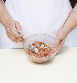 Роздавите, очистіть і подрібніть часник. Дуже дрібно наріжте імбир. Злегка збийте яйця з соєвим соусом, додайте імбир і часник, змішайте з фаршем. Приправте чорним перцем і чилі за смаком. Крок 4