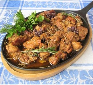 М'якоть свинини нарізати великими кубиками (3-4 см) і смажити на великому вогні в маслі в глибокій сковороді. Коли шматки м'яса підрум'яняться з усіх боків, а кількість рідини сильно зменшиться, погасити м'ясо вином, додати сіль, перець, материнку і розмарин. Влити 2 склянки гарячої води, накрити кришкою і тушкувати до м'якості протягом години. М'ясо подається до столу у власному соусі. Господині на замітку Ця страва з грецької кухні. Вино може бути і червоне, і рожеве. У процесі приготування можна додати трохи лимонного соку. Власне, це не рецепт, а принцип: гарне м'ясо, хороше масло, вино, середземноморські спеції і гарний настрій.