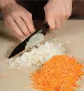 Приготувати соус. Цибулю і моркву очистити, цибулю дрібно нарізати, моркву натерти на крупній тертці. У сотейнику розтопити масло і обсмажити цибулю, 6 хв. Покласти моркву і готувати ще 5 хв. Крок 3