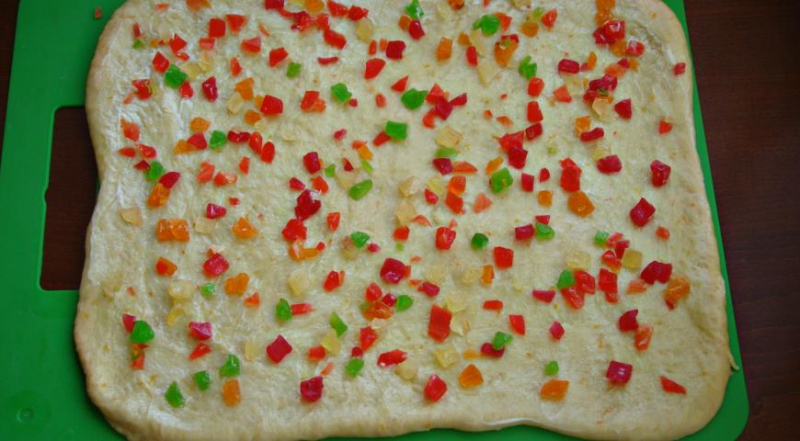 Після вистоювання, тісто розділити на дві частини. Одну частину розкачати в прямокутник, рівномірно змастити залишеним вершковим маслом і розкласти цукати (вишню, родзинки або журавлину). Крок 13